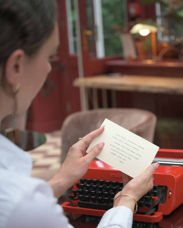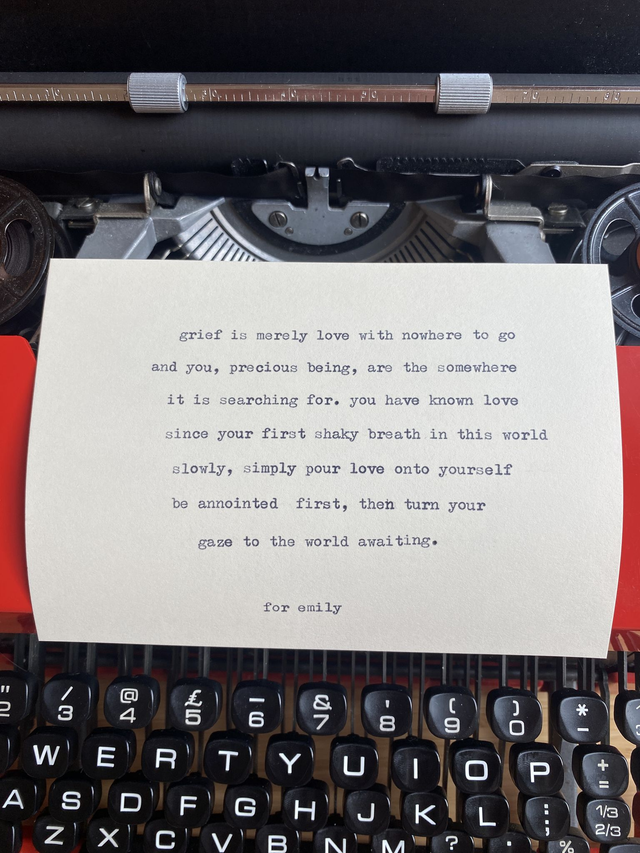 A six to seven line poem I write on the spot, on my typewriter. This is the same style of poem I write for strangers out in the park and at events. Please add the poem to your cart, then you can give me the topic of your custom poem in the "message to merchant" box in the shopping cart. You can tell me anything and everything - something on your mind or heart, or something you saw today that was beautiful.